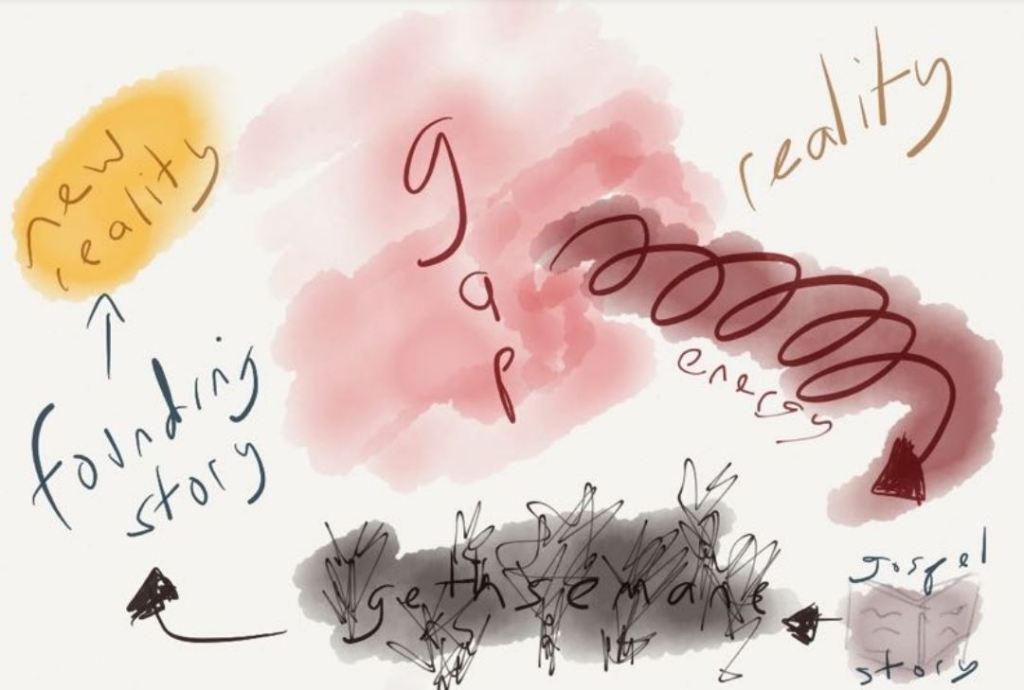We looked at Gerald Arbuckle’s Founding story picture, which portrays a process for starting something. This starts with a gap of dissatisfaction or frustration, which generates the energy for change. Arbuckle calls the challenge of going through this process ‘Gethsemane’. Gethsemane is a wilderness – a kind of liminal space on the frontiers. It would be nice if pioneering didn’t have to involve this, but in practice it pretty much always does.
