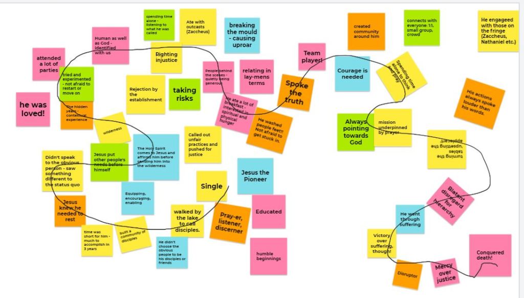 The next activity in our breakout groups was to add notes to the Google Jamboard (see picture below) on what Jesus’s life as a pioneer looked like. It was fun to see the board filling up really quickly. We noticed that although Jesus didn’t pick the obvious people to be his disciples, they became an amazing team. Jesus was loved by God but went through wilderness times and this is a common experience of pioneers. Mission can be scary and we noted Jesus’s incredible courage as well as the quiet generosity of people behind the scenes in supporting him.
